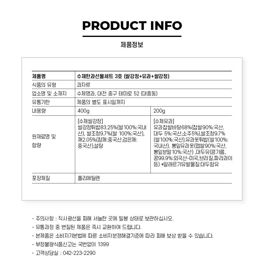 | 생산자 및 소재지(수입품의 경우 생산자, 수입자 및 제조국) | 서판석수제명과 - 대전광역시 중구 테미로 52 |
