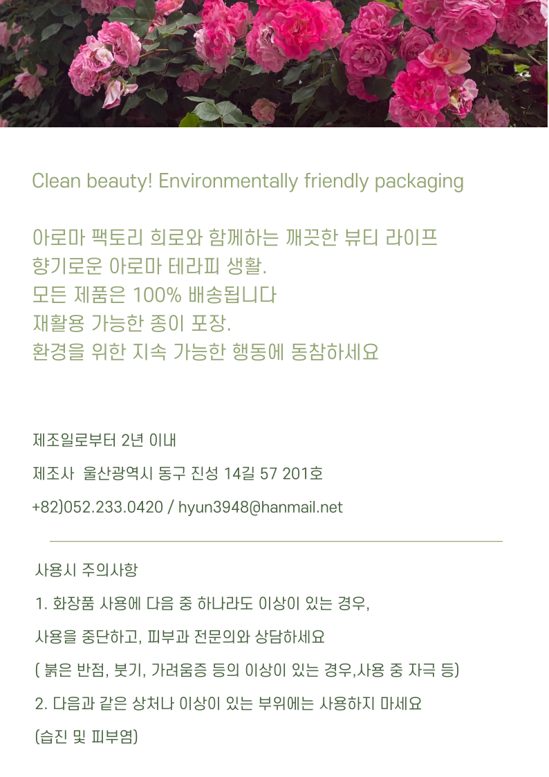 | 화장품제조업자 및 화장품책임판매업자 | 울산 동구 진성14길 57 201호 아로마팩토리희로 |