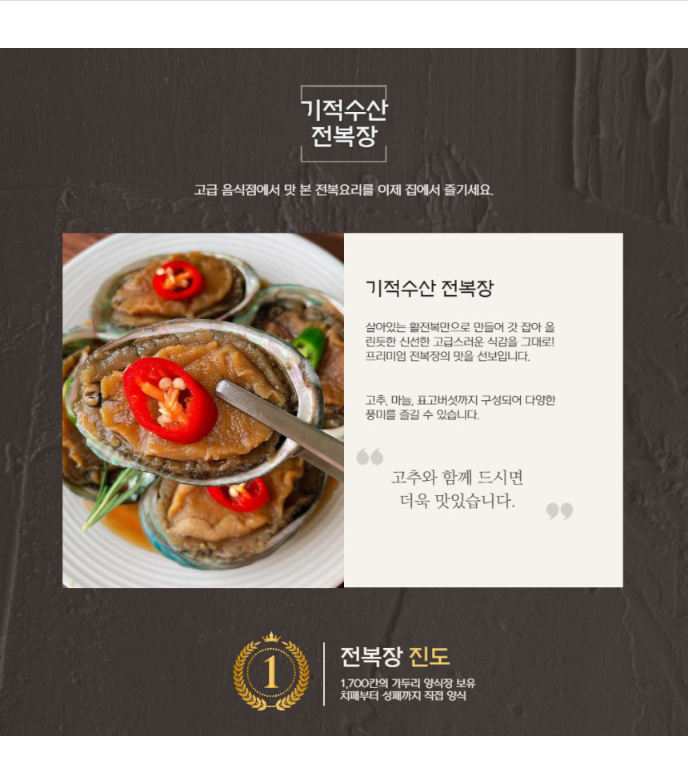 | 원재료명 (「농수산물의 원산지 표시 등에 관한 법률」에 따른 원산지 표시 포함) 및 함량(원재료 함량 표시대상 식품에 한함) | 전복(국내산), 조림용장, 표고버섯, 고추, 마늘 |