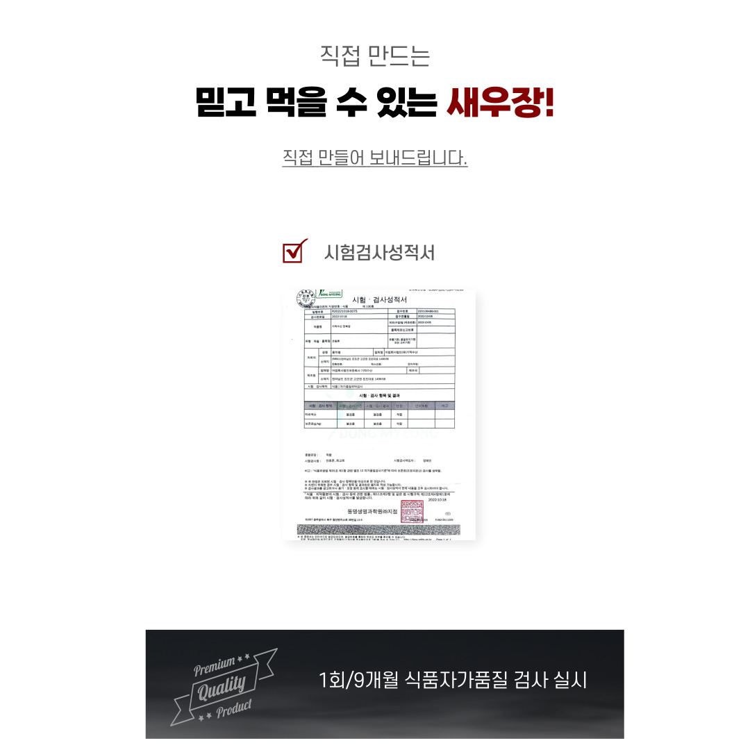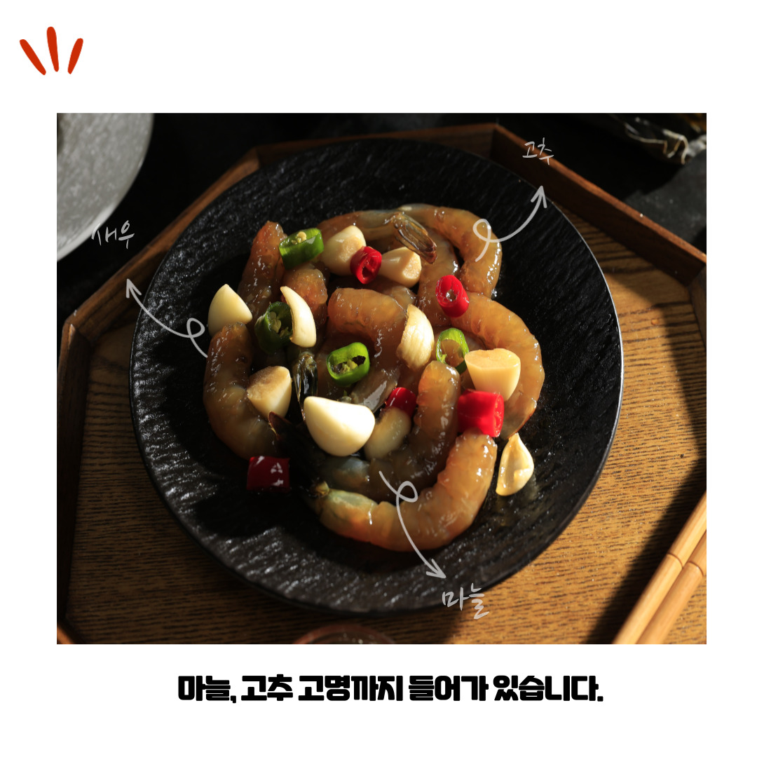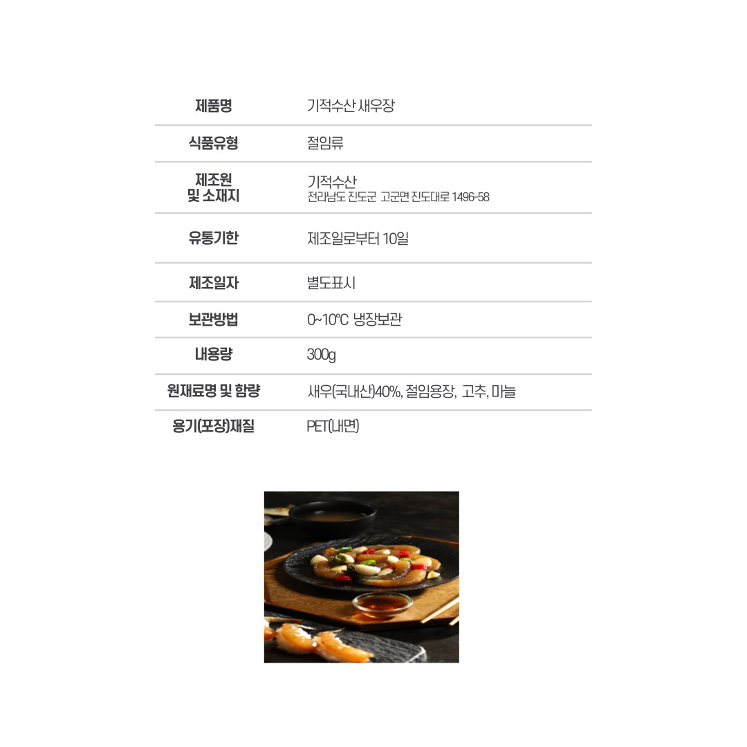 원재료명 (「농수산물의 원산지 표시 등에 관한 법률」에 따른 원산지 표시 포함) 및 함량(원재료 함량 표시대상 식품에 한함) | 새우(국내산), 절임용장, 양파, 고추, 마늘 |