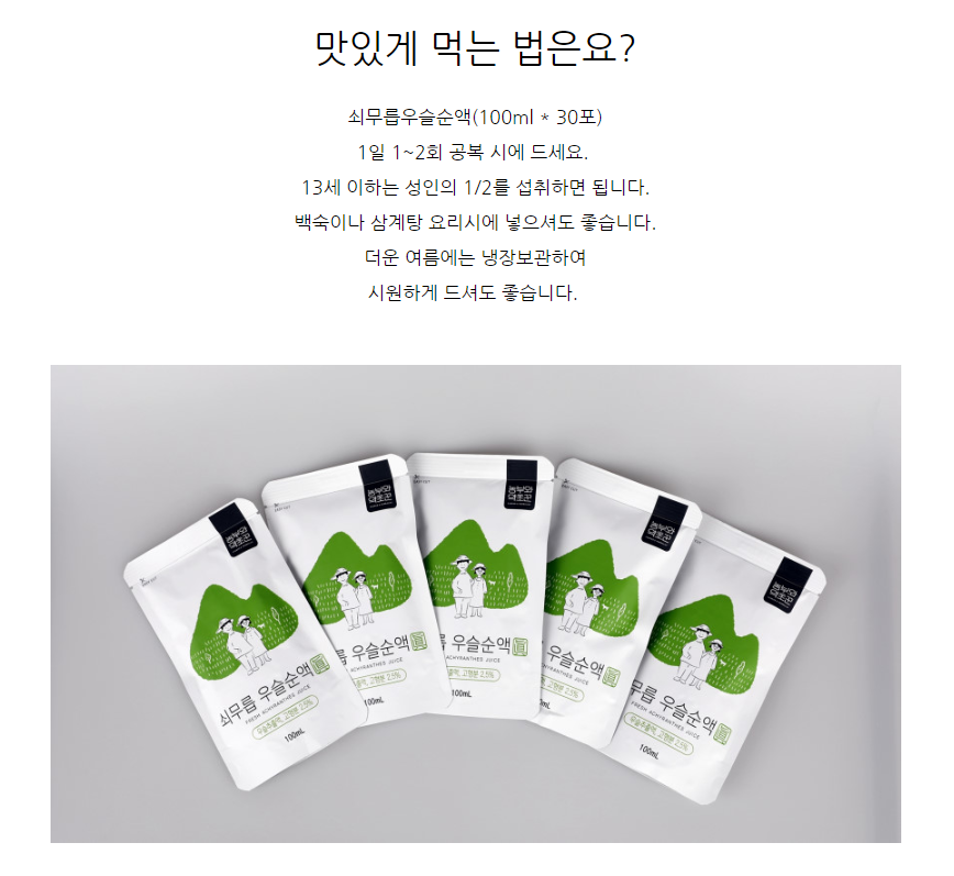 | 제품명 | 유기농 저온추출 우슬즙 선물용 100ml 30포 |