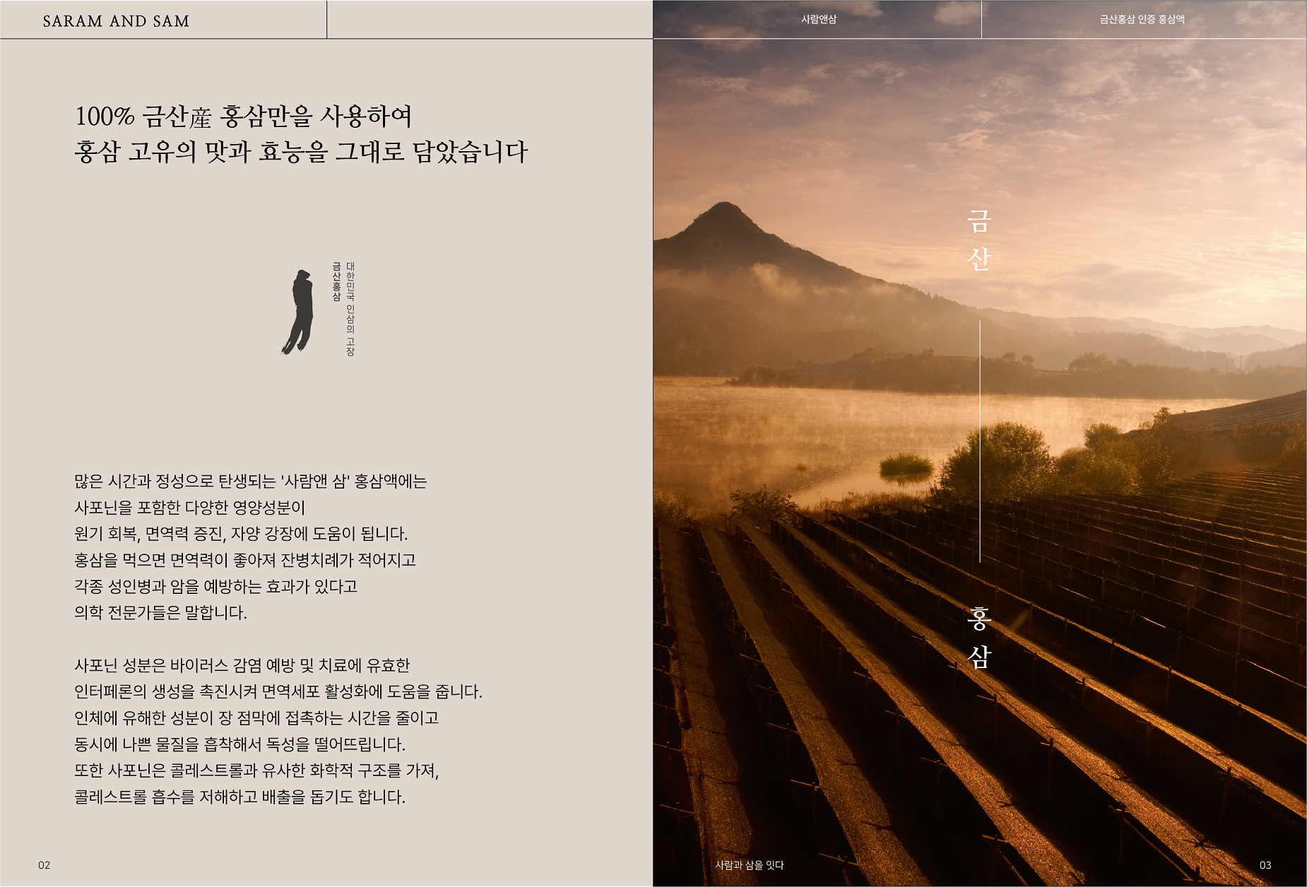 충청남도 최남단에 위치한 금산군은 1,500년 전부터 인삼으로 유명했던 곳으로서 김부식의 <삼국사기>에도 기록되어 있을 만큼 뛰어난 인삼 재배지였습니다. 오늘날 금산군은 인삼의 고장에서 한 걸음 더 나아가 세계적 건강 도시로 거듭나고자 합니다. 인삼을 이용한 다양한 특산물 개발은 물론 금산인삼·약초 세계화 및 명품화에 힘쓴 결과 금산의 인상농업은 세계 식량농업기구의 세계중요농업유산으로 등재되는 쾌거를 이루었습니다. 또한 금산군에서는 충남의 최고봉 서대산, 예로부터 풍류객들의 발길이 끊이지 않았던 적벽강 등의 10경(景)과 인삼어죽, 산채 약선요리, 인삼튀김 등의 10미(味), 인삼을 기반으로 만든 한과, 비누, 샴푸 등의 10품(品)이 있어 더없이 알찬 관광을 즐기실 수 있습니다.