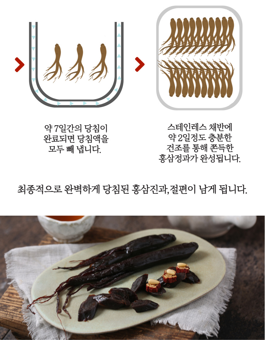 | 원재료명 (「농수산물의 원산지 표시 등에 관한 법률」에 따른 원산지 표시 포함) 및 함량(원재료 함량 표시대상 식품에 한함) | 홍삼(국산,4년근이상)55%, 액상과당 %, 사양벌꿀(국산), 저감미당 ※ 원료삼 배삽비율 : 홍삼 100% |