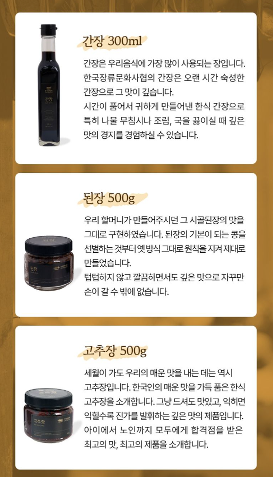 | 포장단위별 내용물의 용량(중량), 수량 | 고추장 500g, 된장 500g, 간장 300g |