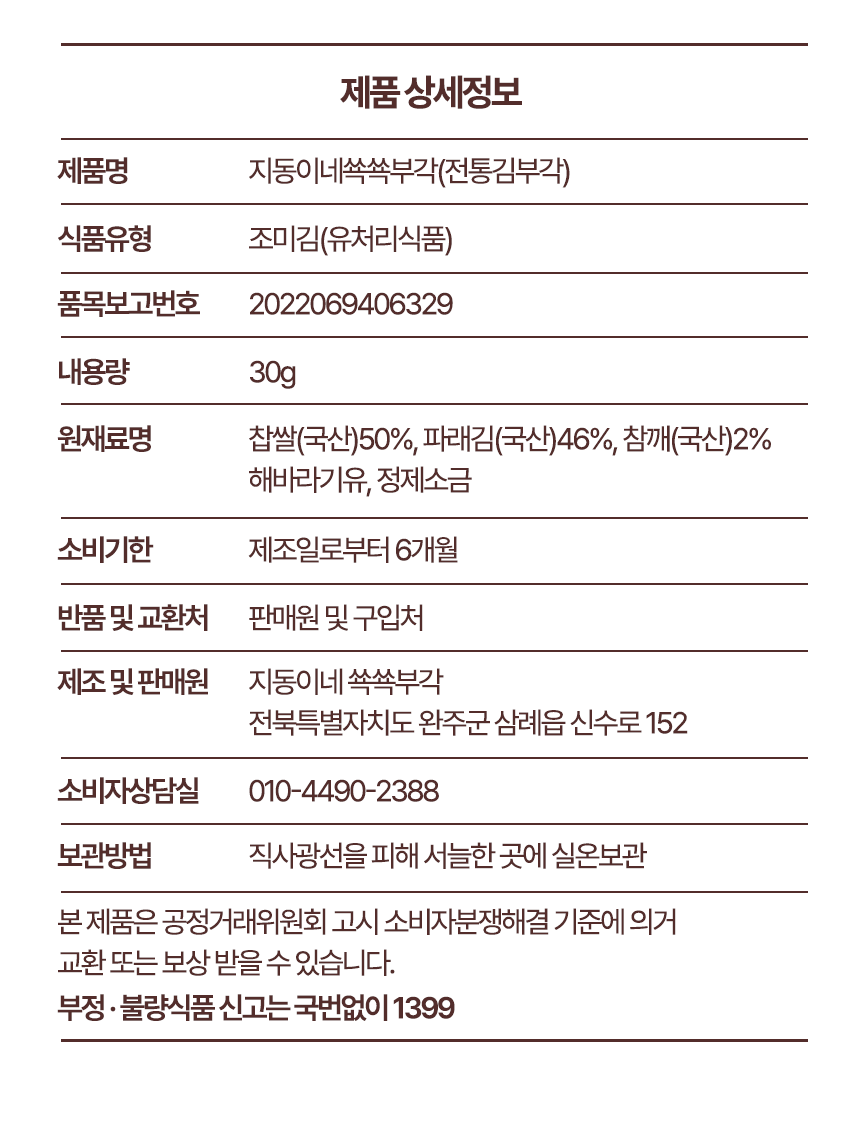 | 생산자 및 소재지(수입품의 경우 생산자, 수입자 및 제조국) | 지동이네 쑉쑉부각 전북특별자치도 완주군 삼례읍 신수로152 |