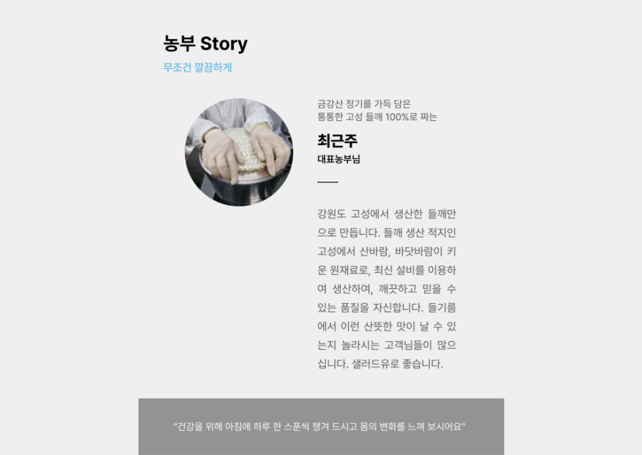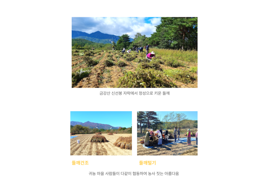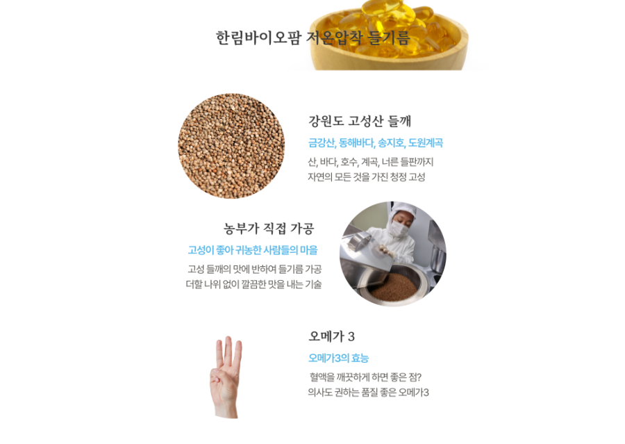 | 원재료명 (「농수산물의 원산지 표시 등에 관한 법률」에 따른 원산지 표시 포함) 및 함량(원재료 함량 표시대상 식품에 한함) | 강원도 고성산 들깨 100% |