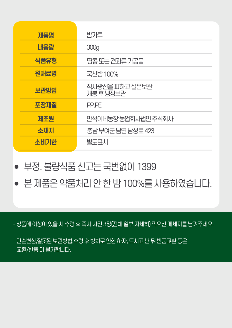 | 포장단위별 내용물의 용량(중량), 수량 | 밤가루300g |