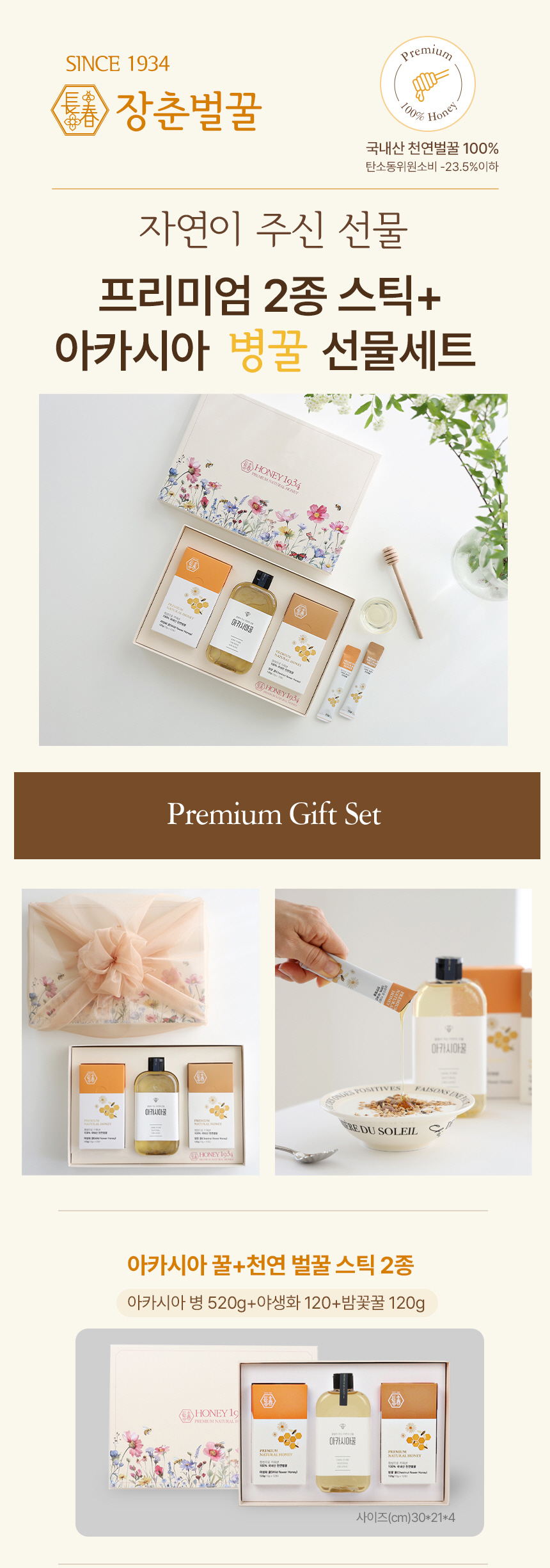 아카시아 병꿀, 스틱 2종 선물세트 760g(병꿀 520g+꿀스틱 120g*2개)