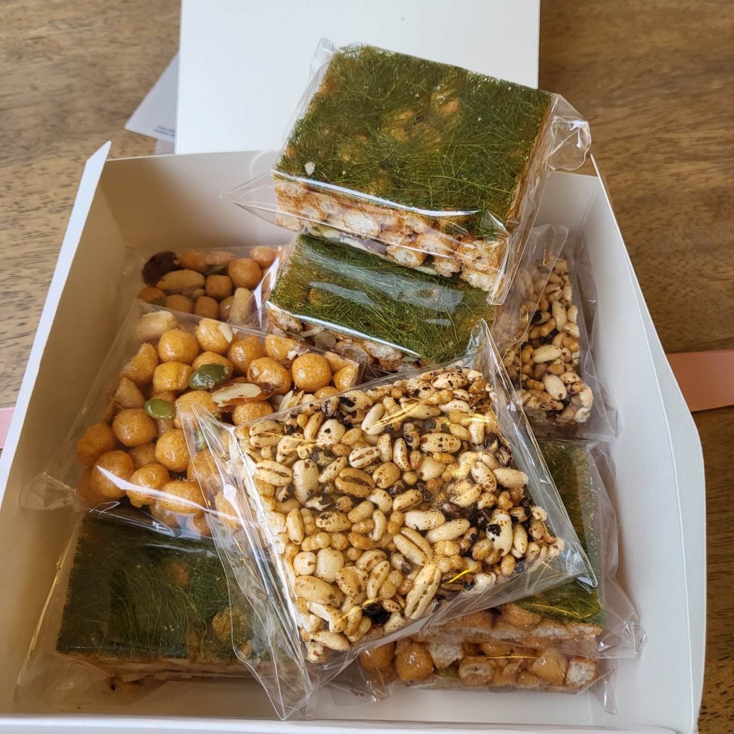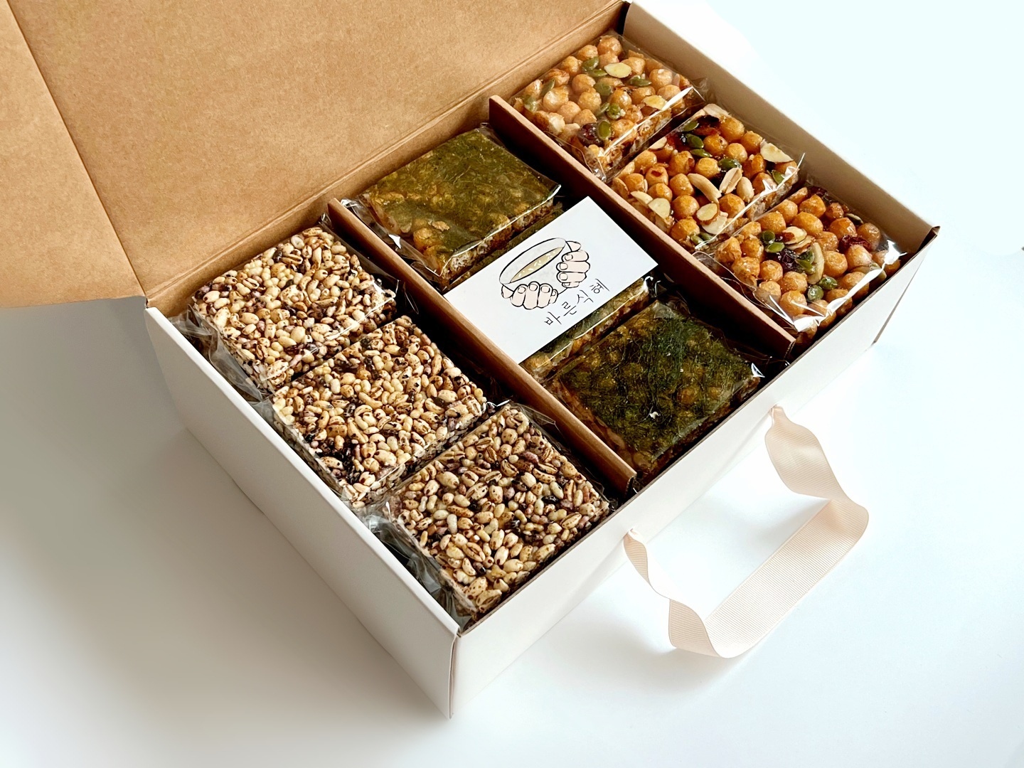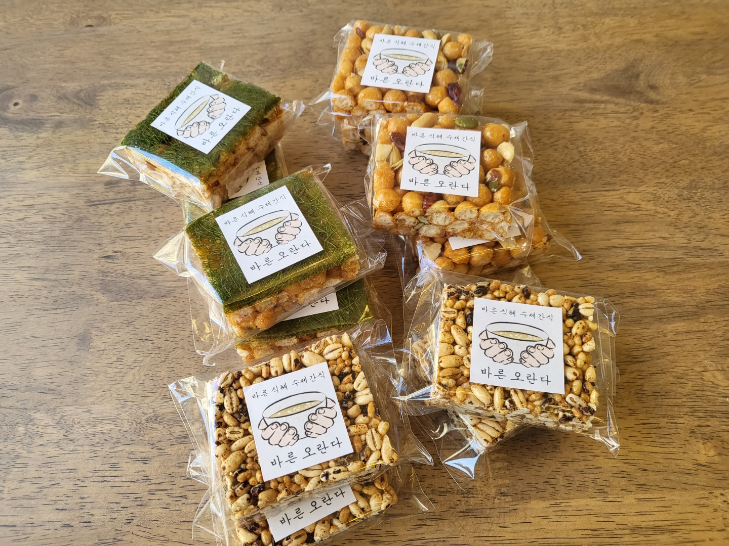 바삭하면서도 쫀득한 식감을 잘 살리려 물엿과 조청을 알맞게 배합하고, 각종 견과를 첨가해 고소한 풍미를 극대화 하였습니다.