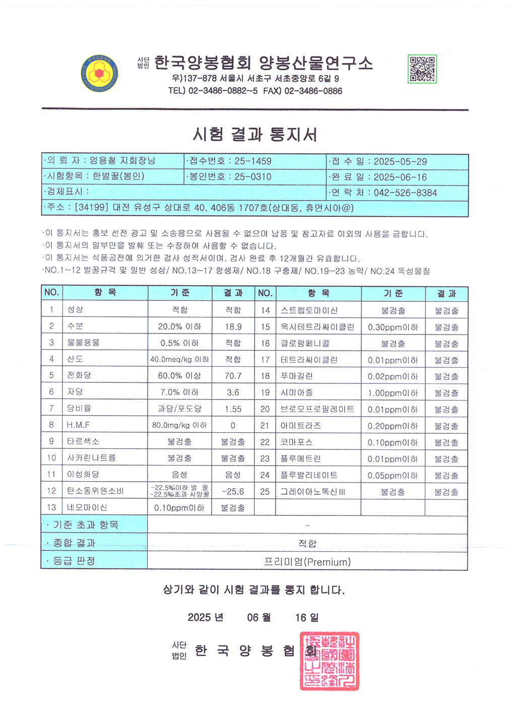| 법에 의한 인증ㆍ허가 등을 받았음을 확인할 수 있는 경우 그에 대한 사항 | (사)한국양봉협회에서 검사를 마친 최상급프리미엄벌꿀입니다. |