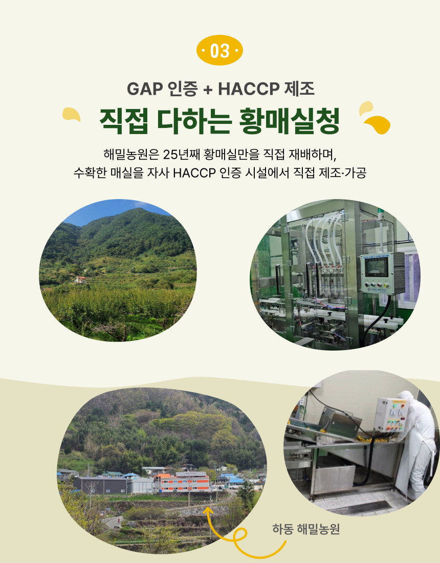 | 소비자 안전을 위한 주의사항 | 1. 본 제품은 농축된 황매실 원액으로, 권장 희석 비율 (물 또는 탄산수 1:4~1:5) 또는 기호에 따라 희석하여 음용하십시오. 2. 직사광선을 피해 서늘하고 건조한 곳에 보관하십시오. 3. 침전물이 생길 수 있으나, 이는 황매실의 천연 성분이므로 안심하고 흔들어 드십시오. 4. 당알코올, 인공감미료, 보존료를 첨가하지 않았으며, 원물의 당류가 농축되어 당뇨 등 건강에 민감하신 분은 섭취 전 전문가와 상담하십시오. 5. 어린이, 임산부, 특이 체질 |