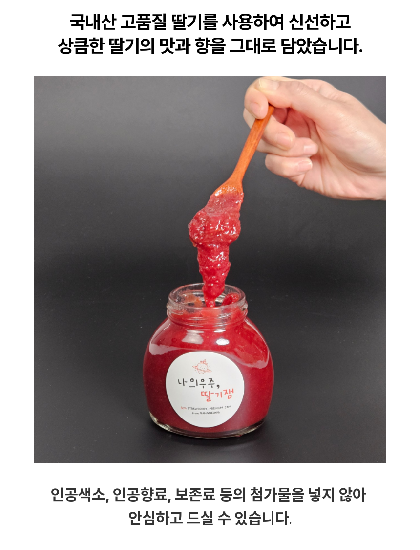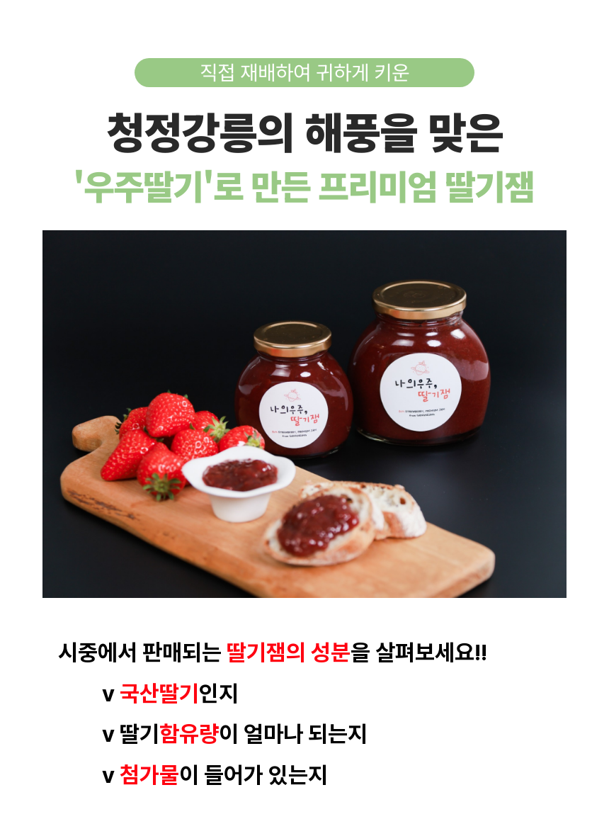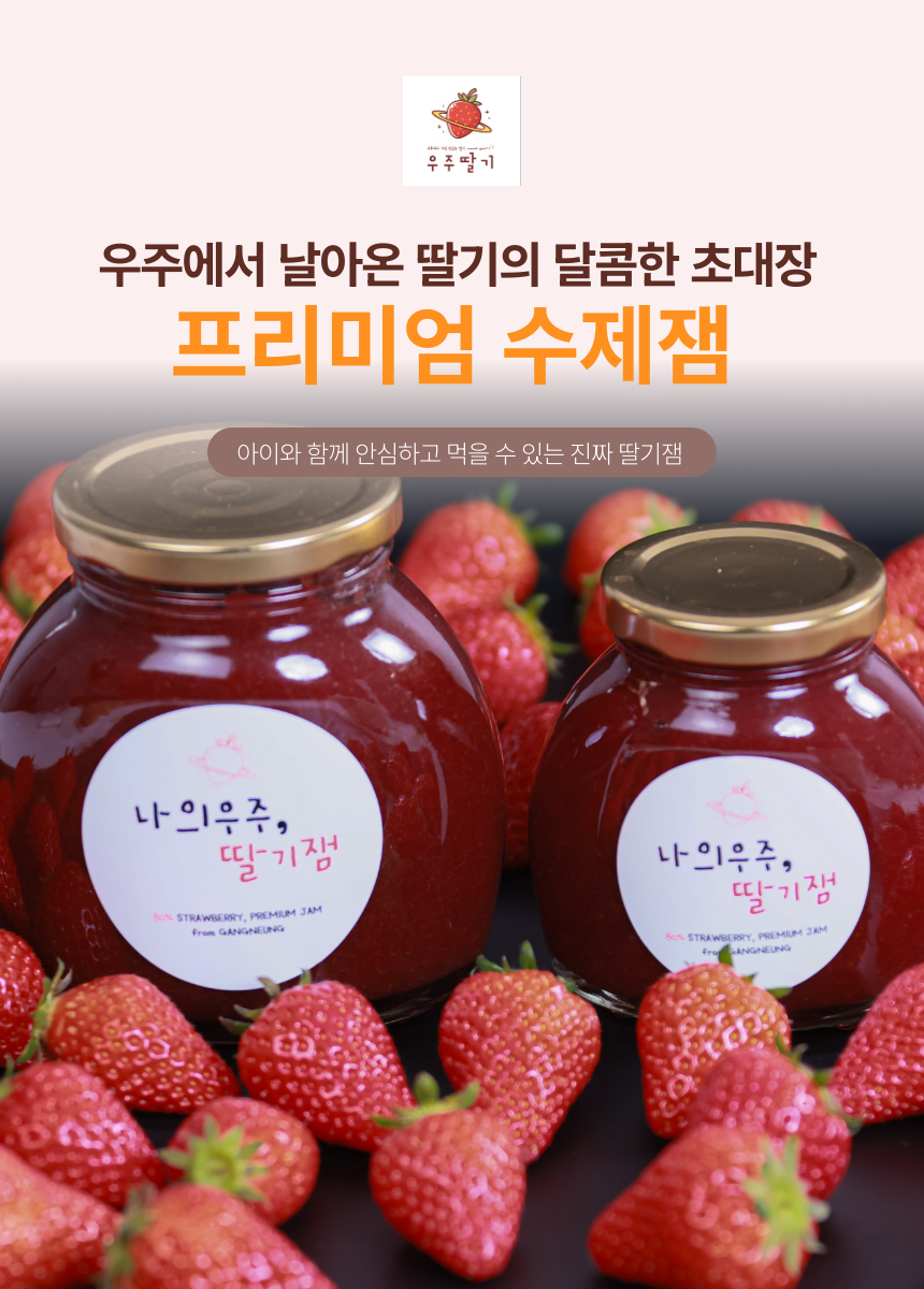 | 원재료명 및 함량 | 나의우주,딸기잼 : 딸기 80%, 설탕 19%, 레몬즙 / 우주에서온딸기잼 : 딸기82%, 설탕16%, 레몬즙 |