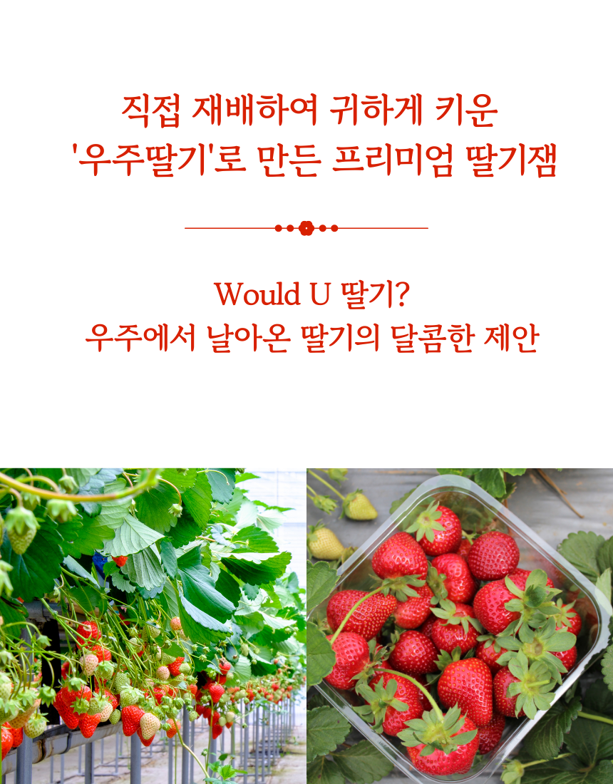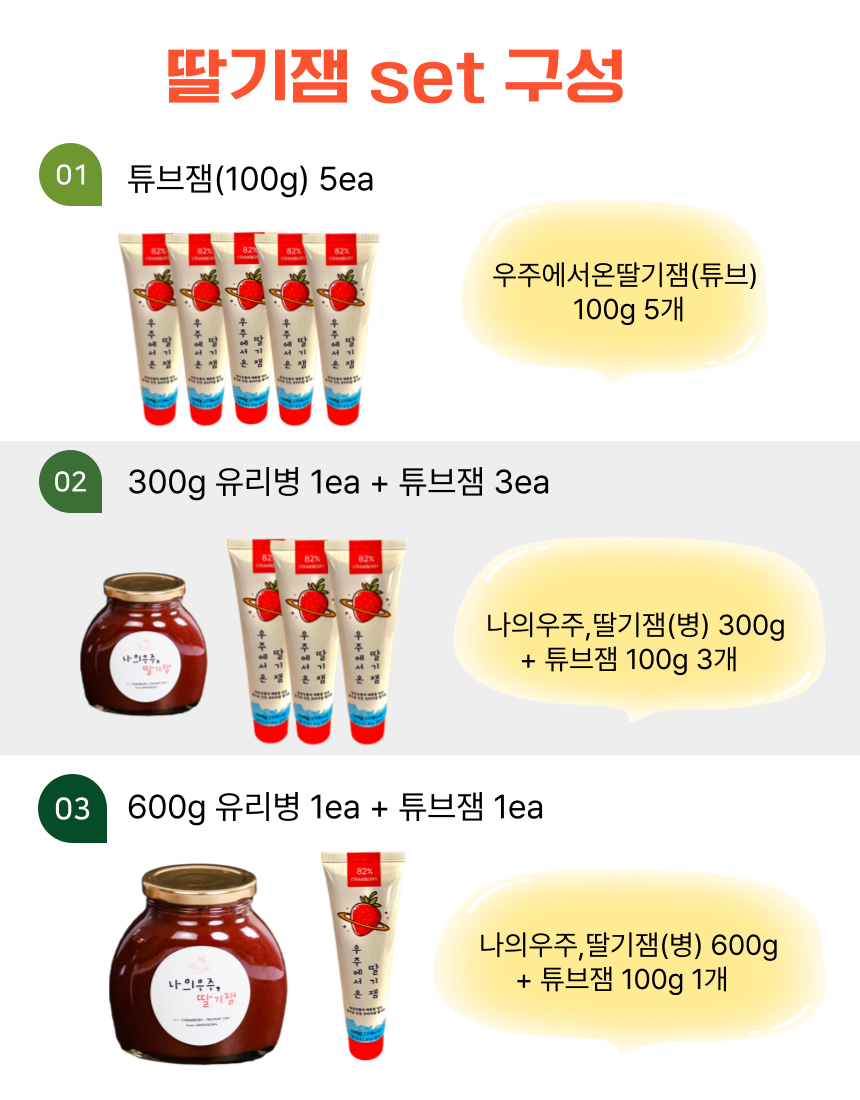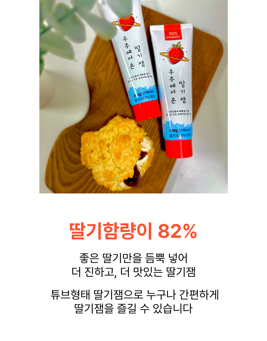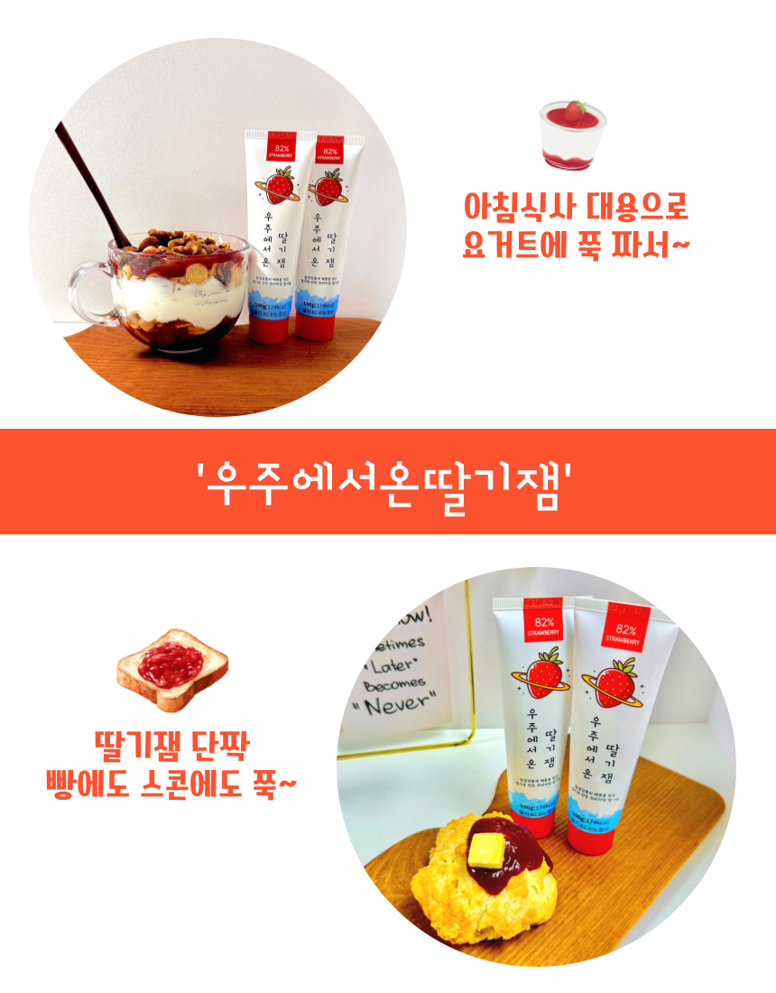 | 원재료명 및 함량 | 나의우주,딸기잼 : 딸기 80%, 설탕 19%, 레몬즙 / 우주에서온딸기잼 : 딸기82%, 설탕16%, 레몬즙 |