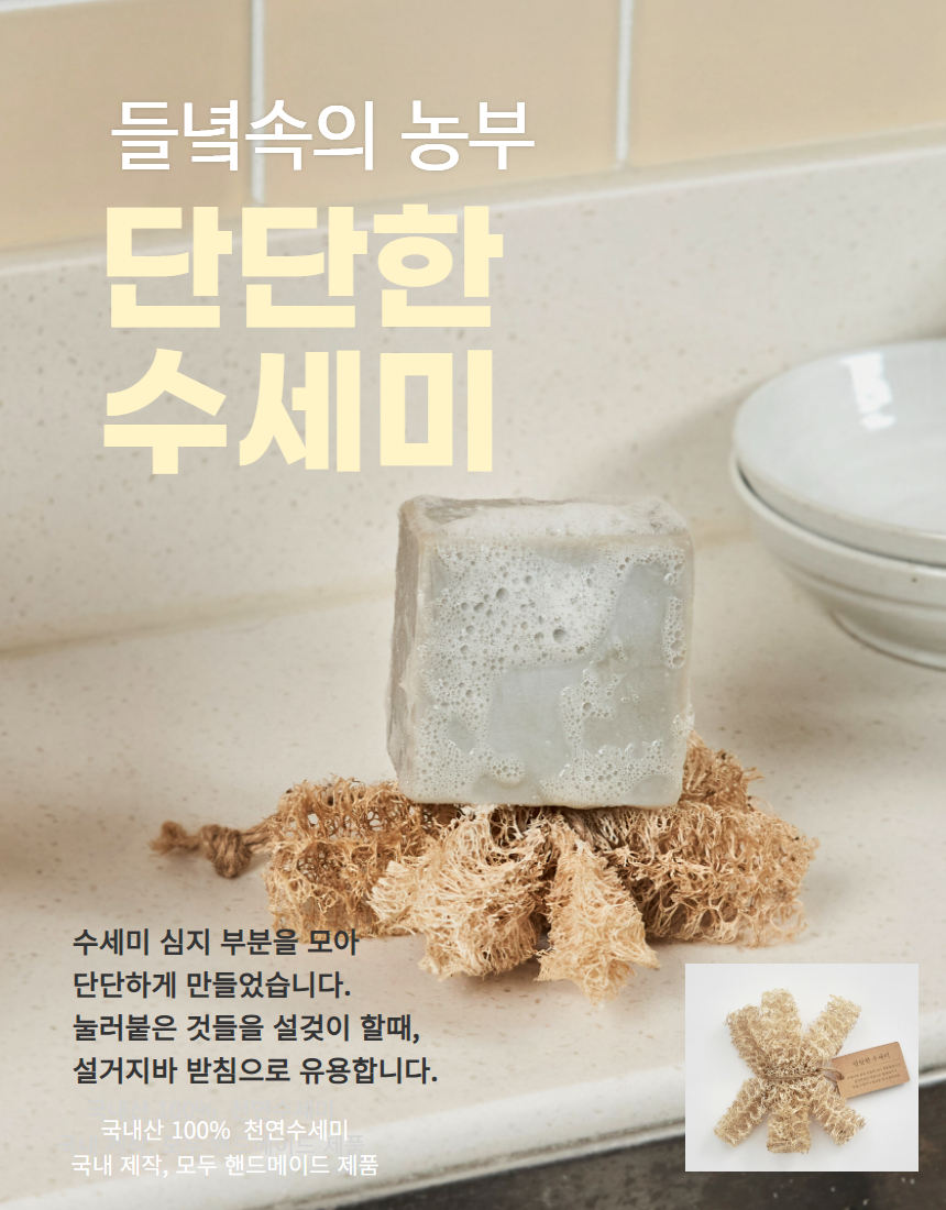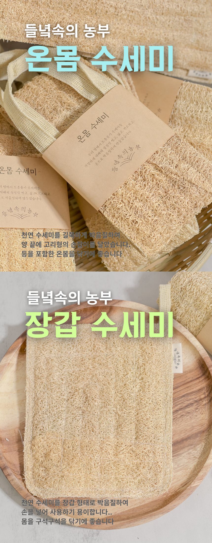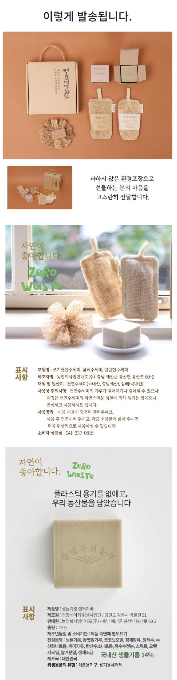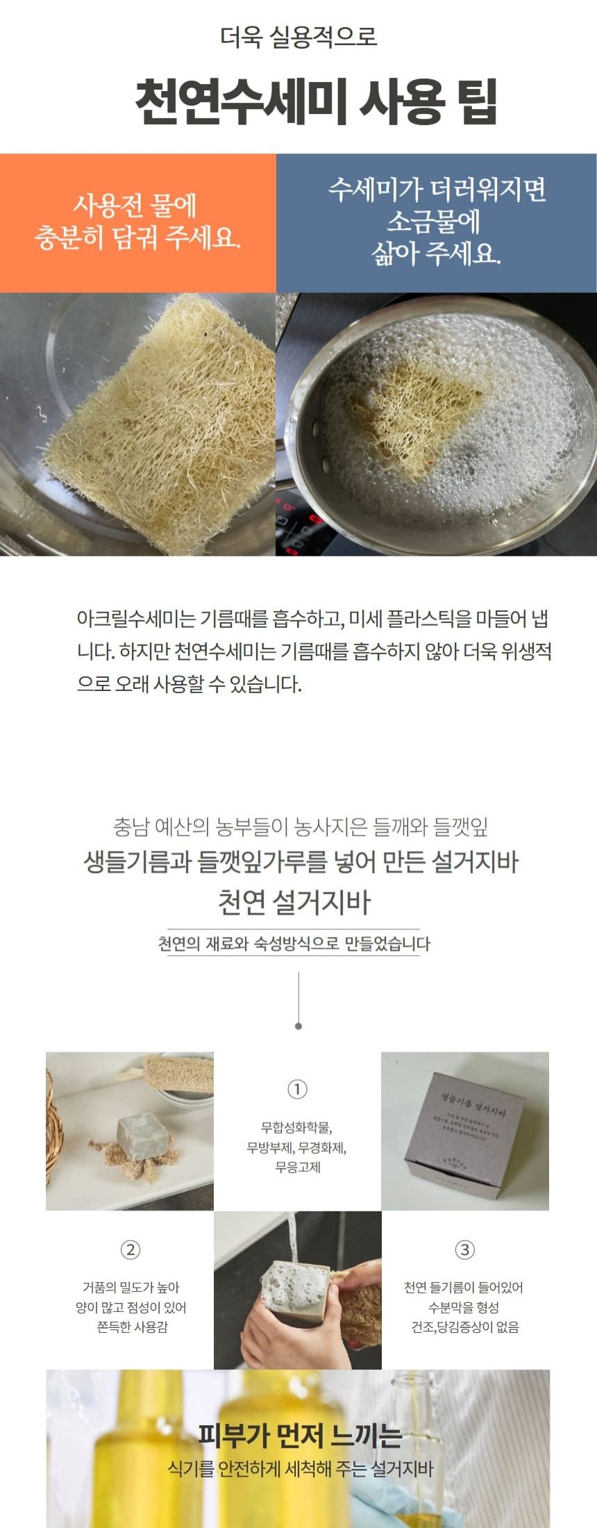 쓰기 편한 수세미 1개 + 삼베 수세미 1개 + 단단한 수세미 1개 + 온몸 수세미 1개 + 장갑 수세미 1개 + 생들기름 설거지바 1개로 구성된 세트 입니다.