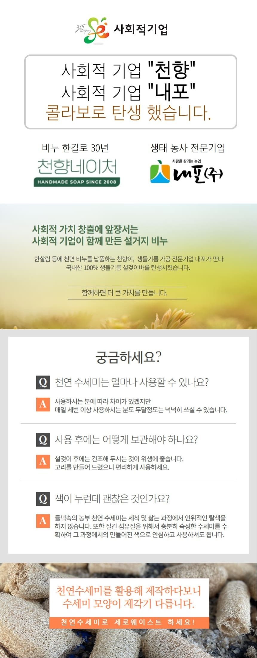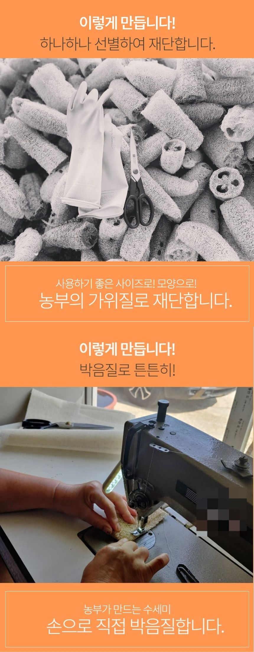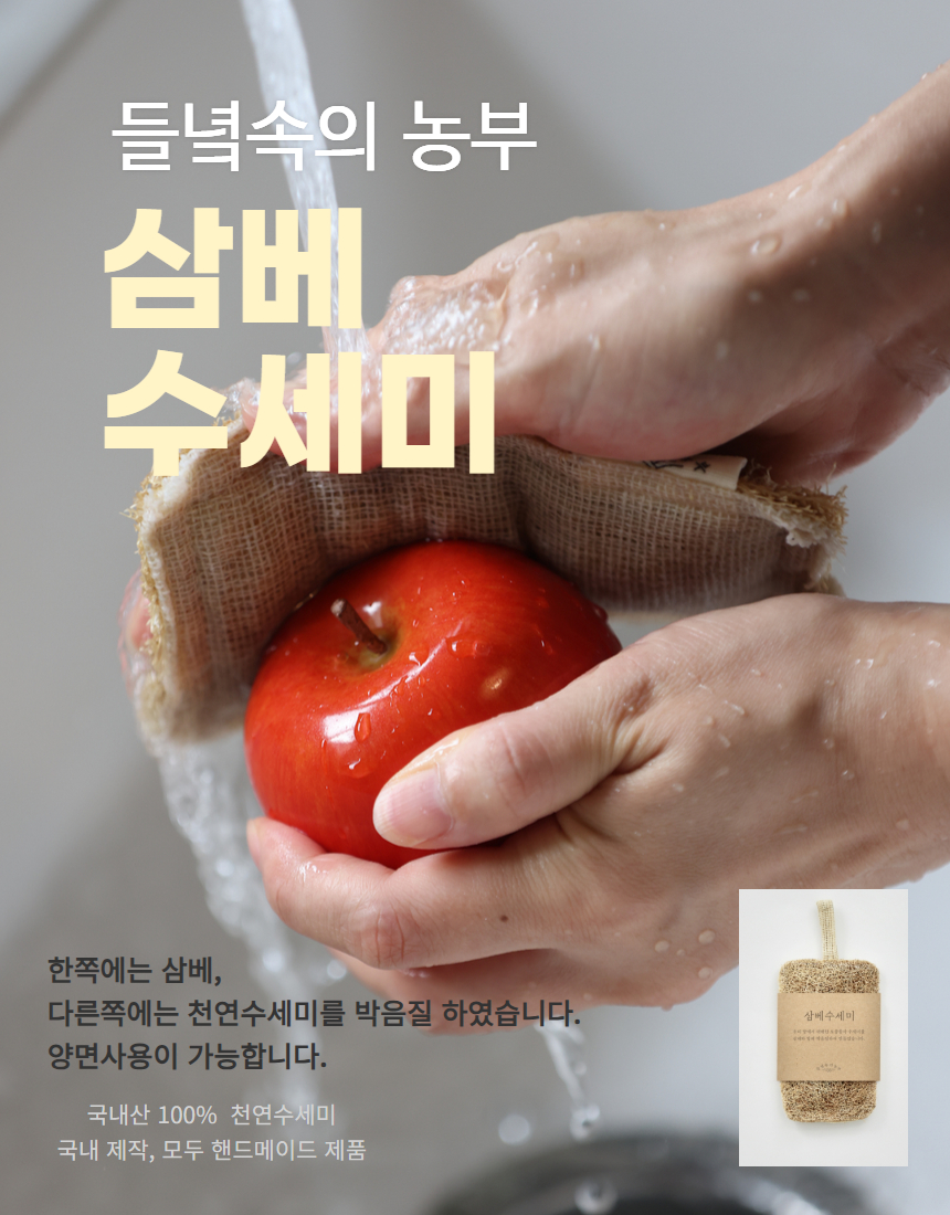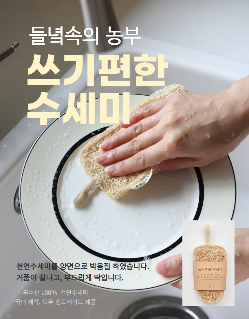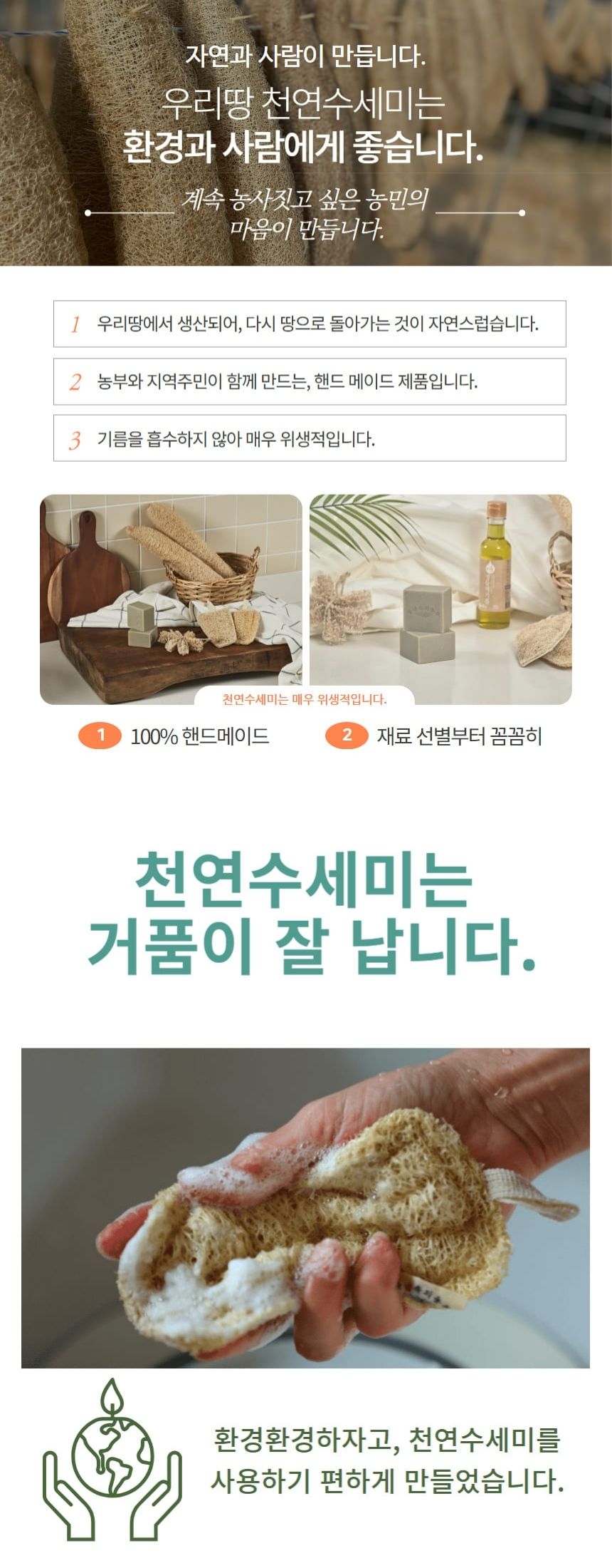 쓰기 편한 수세미 1개 + 삼베 수세미 1개 + 단단한 수세미 1개 + 온몸 수세미 1개 + 장갑 수세미 1개 + 생들기름 설거지바 1개로 구성된 세트 입니다.