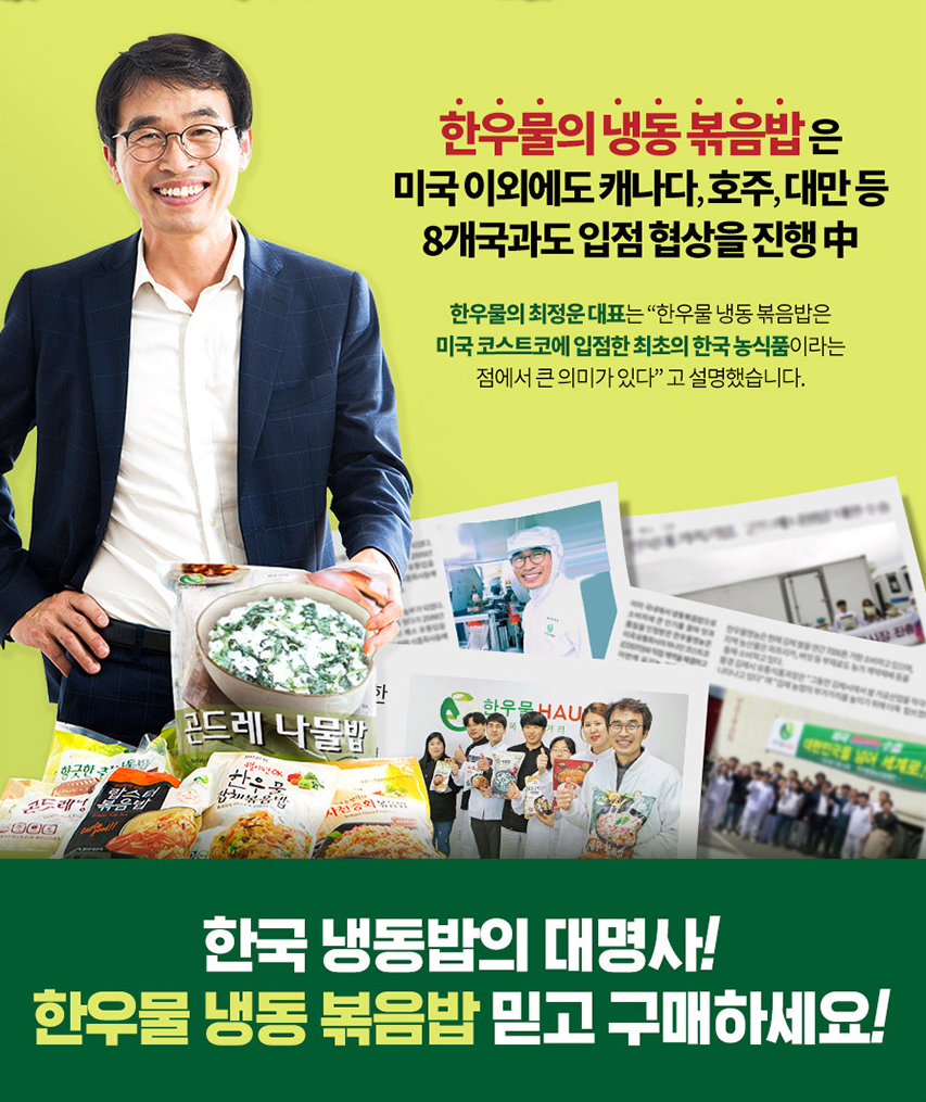 | 포장단위별 내용물의 용량(중량), 수량 | 통새우볶음밥 300g*7 / 유기농 곤드레나물밥 262g*5 |