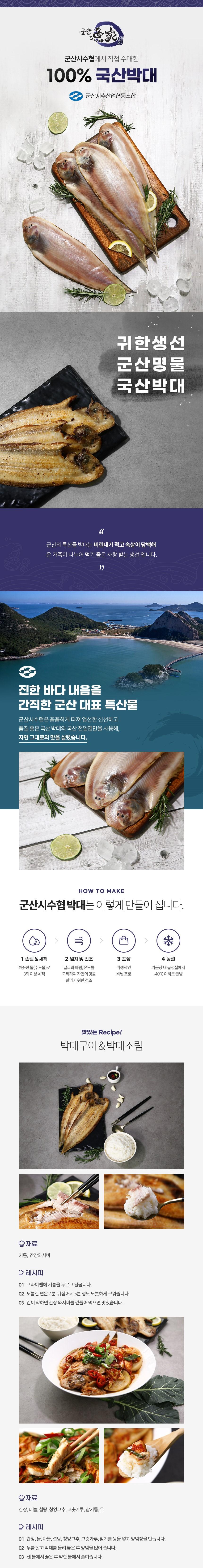※ 군산어가 박대는 믿을 수 있는 수협에서 직접 수매하여 손질(껍질제거)과 세척 후 천일염으로 염지하여 반건조한 제품으로 손질없이 바로 드실 수 있습니다.