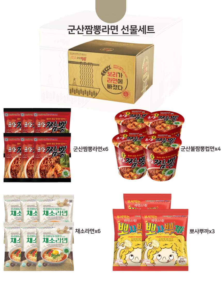 군산짬뽕라면 선물세트(짬뽕라면 6개+불짬뽕컵면 4개+채소라면 6개+뽀사뿌까 3개)