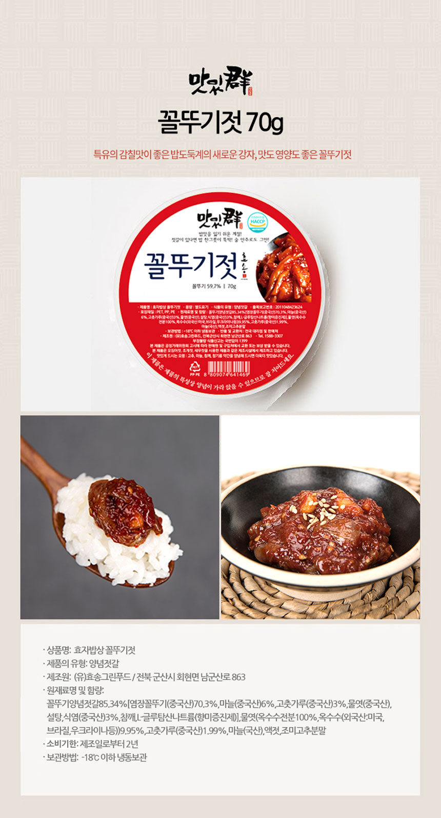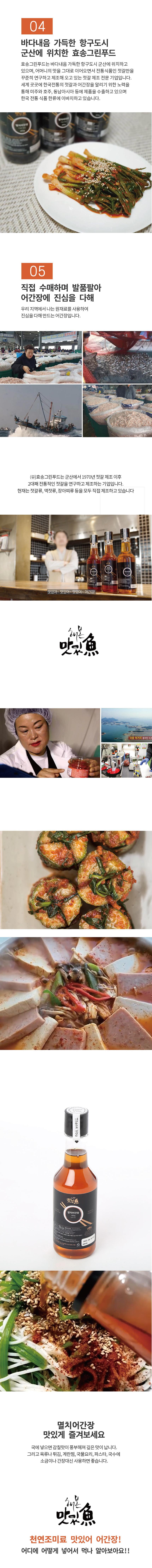 | 제조연월일, 소비기한 또는 품질유지기한 | 상시제조/ 양념젓갈 소비기한 :제조일로부터 6개월, 어간장 품질유지기한 : 제조일로부터 3년 |