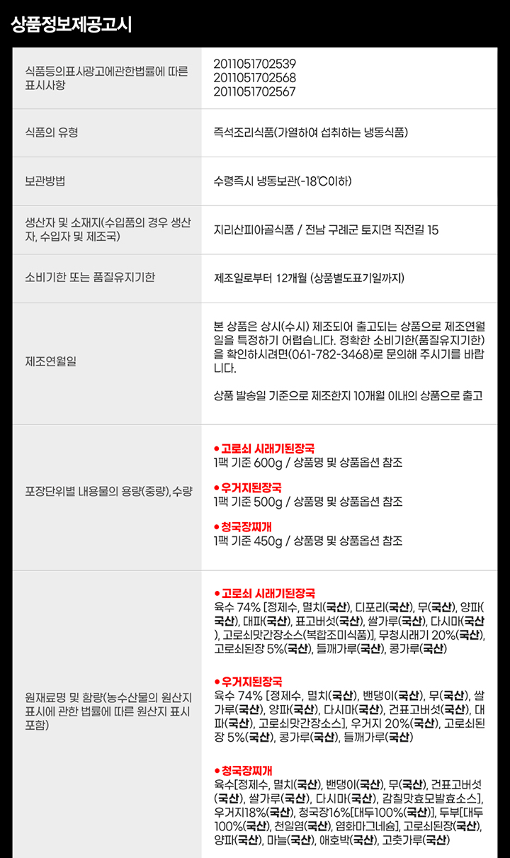 | 원재료명 및 함량 | 상세정보 별도표기 |