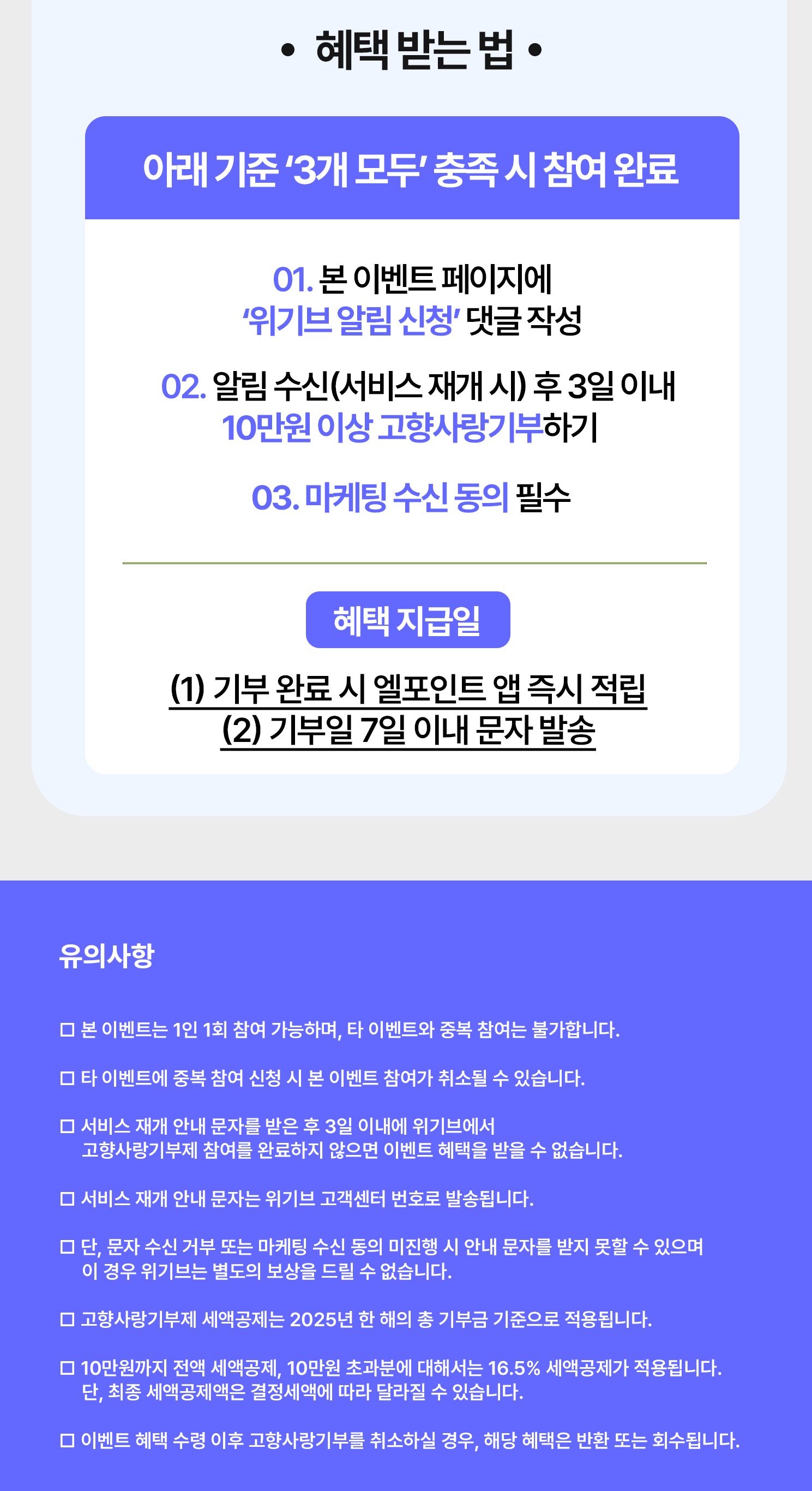 사전 예약 참여 고객만을 대상으로 위기브는 롯데그룹의 통합 멤버십 엘포인트와 손을 잡고, 고향사랑기부 참여 고객에게 파격적인 엘포인트 추가 적립 혜택을 제공합니다.