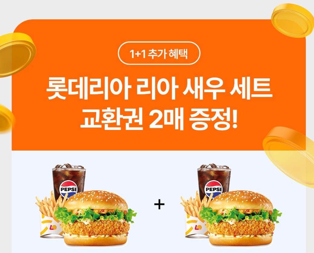 5️⃣ 추가 혜택으로 롯데리아 '리아 새우 세트' 교환권 2매 (1+1 혜택) 를 드려요!