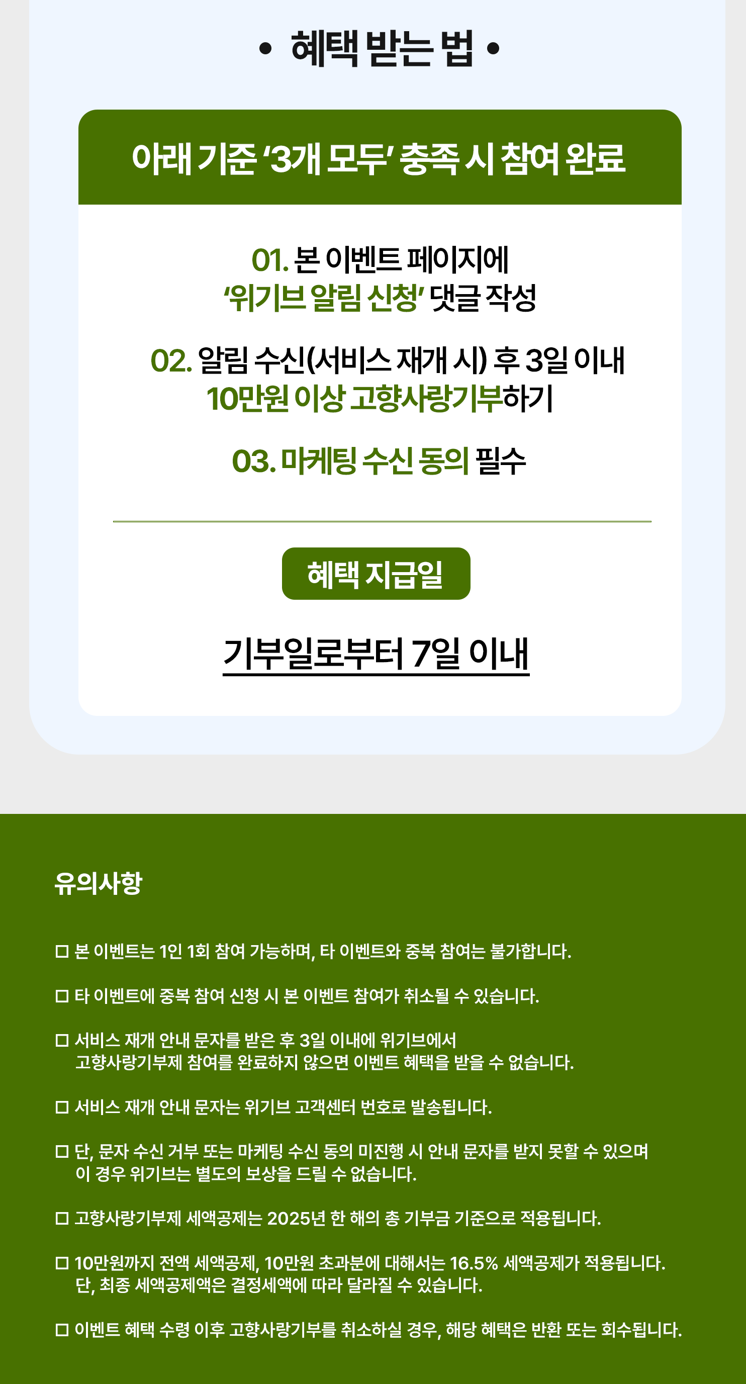 알림 수신 후 3일 이내에 10만원 이상 기부를 완료합니다. (기부 시 마케팅 수신 동의 필수)