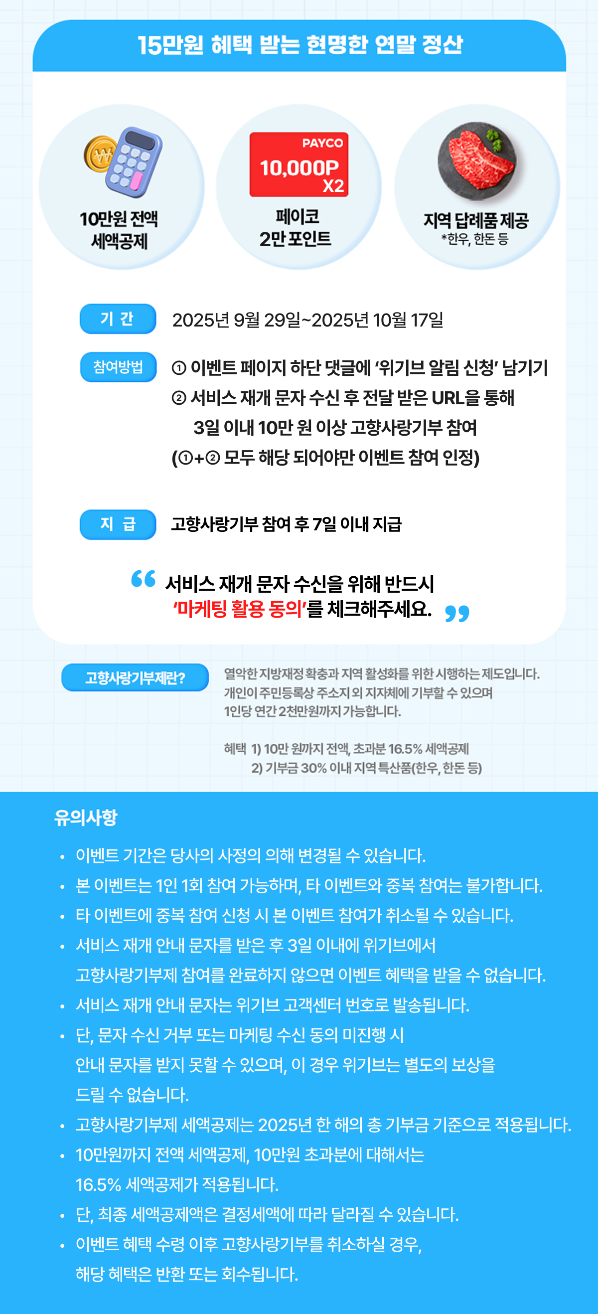 이벤트 기간 동안 위기브를 통해 고향사랑기부제에 10만원 이상 참여하시면, 페이코 10,000 포인트를 받고, 거기에 10,000 포인트를 한번 더! 총 2만 포인트를 받게 됩니다.