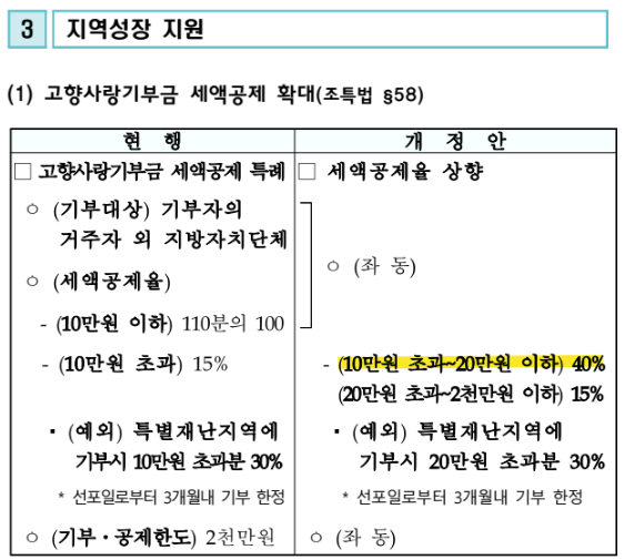 10만 원 초과 20만 원 이하 기부 시 세액공제율이 16.5% → 40%로 상향되면서, 이제 20만 원을 기부하면 20만 원을 100% 그대로 돌려받게(14만원 세액공제, 6만원 답례품) 됩니다.