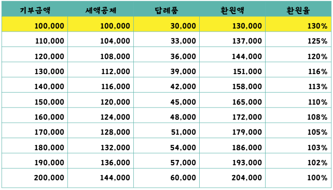 2. 하지만, 여전히 가장 수익률이 높은 구간은 '10만원'(10만원 기부 ↔ 10만원 세액공제 + 3만원 답례품)