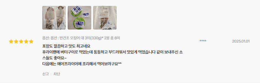 "존맛이에요 반건조 오징어 이렇게 부드럽고 쫀득한건 처음이네요"