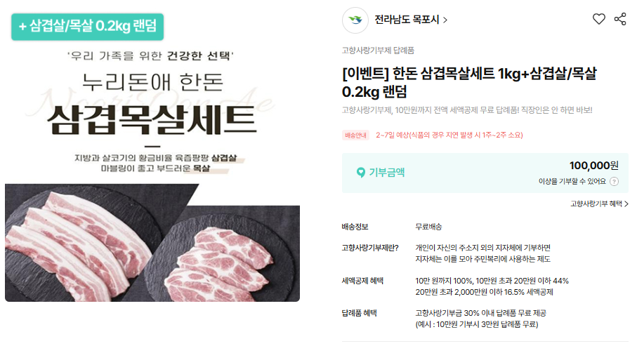평소처럼 삼겹살을 사 먹는 것과 비슷한 비용을 사용하면서도, 지역을 돕고 추가 혜택까지 받을 수 있다는 점에서 많은 관심을 받고 있는 방식입니다.