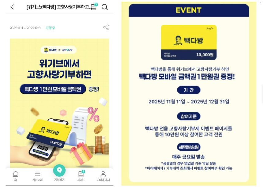 1️⃣ 위기브를 통해 10만원 기부 시 전액 세액공제와 답례품, 추가 1만원 쿠폰까지