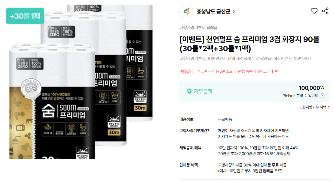 충남 금산 답례품으로 받을 수 있는 ‘천연펄프 숨 프리미엄 3겹 화장지 90롤’은 그런 선택지 중 하나입니다.