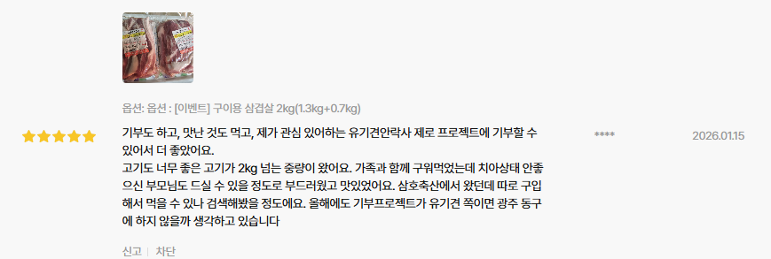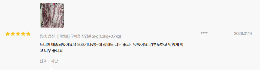 그래서인지 단순히 ‘고기 한 팩’이 아니라, 구이용 + 찌개용, 수육용 등으로 다양하게 먹을 수 있는 실용적인 구성이라는 평가가 이어집니다.
