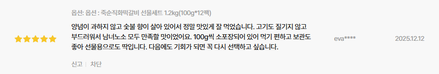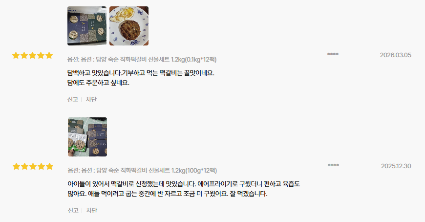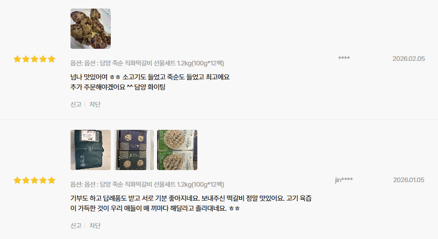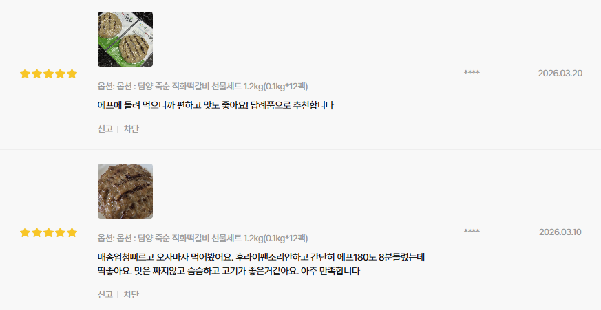 이 답례품은 한돈과 한우에 죽순을 더해 식감과 영양을 살리고, 직화와 오븐을 거쳐 은은한 불맛까지 살린 떡갈비입니다. 그래서인지 후기에서도 맛 표현을 넘어 조리부터 식감까지 구체적인 이야기가 많이 등장합니다.