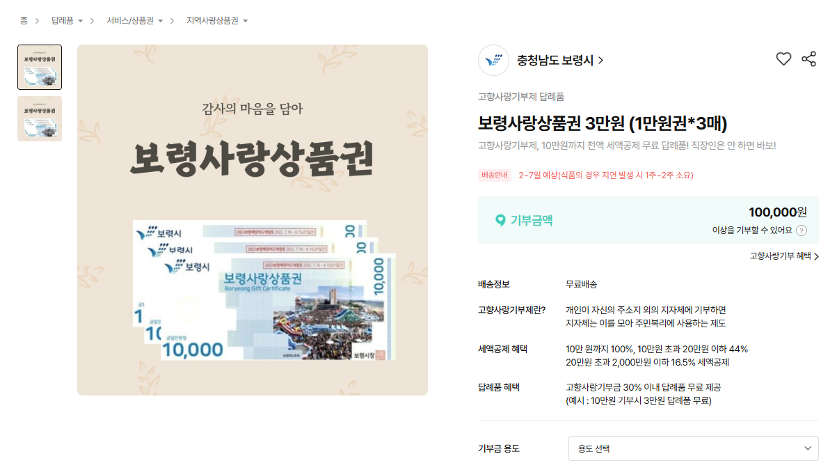 3️⃣ 보령에 고향사랑기부를 하면 세액공제와 답례품 혜택을 받을 수 있고, 답례품인 보령사랑상품권은 보령시 가맹점에서 사용할 수 있어 축제 방문 때 식사나 간단한 소비에 보탤 수 있습니다.