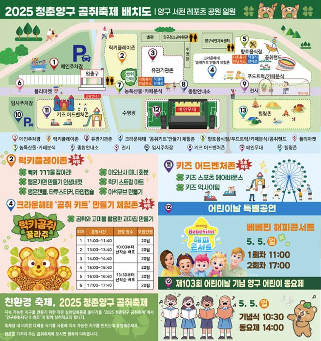 여기에 친환경 나무 놀이터 체험, 크라운해태 과자집 만들기, 농촌체험마을 프로그램, 어린이날 특별공연과 각종 이벤트, 곰취홍보관과 친환경 전시, 먹거리와 판매 부스, MBC 라디오 공개방송 같은 연계 행사도 마련돼 있습니다.