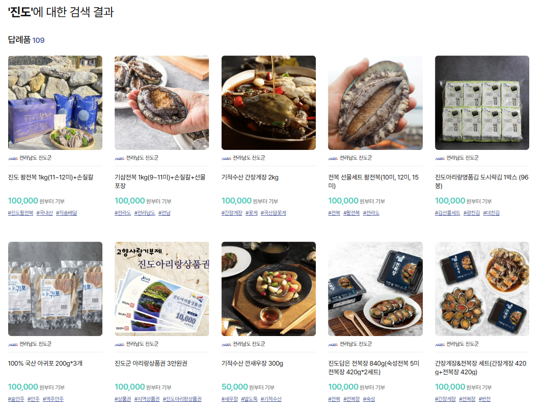10만 원을 진도군에 기부하면 10만 원 전액 세액공제 혜택으로 연말정산 때 100% 돌려받고, 추가로 기부금의 30%인 3만 원 상당의 진도 특산물이나 진도아리랑상품권을 답례품으로 받을 수 있어요.