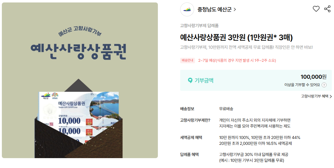 고향사랑기부제는 10만 원 이하 100%, 10만 원 초과 20만 원 이하 44%의 세액공제가 적용되며, 예산사랑상품권은 군내 가맹점에서 사용할 수 있다.