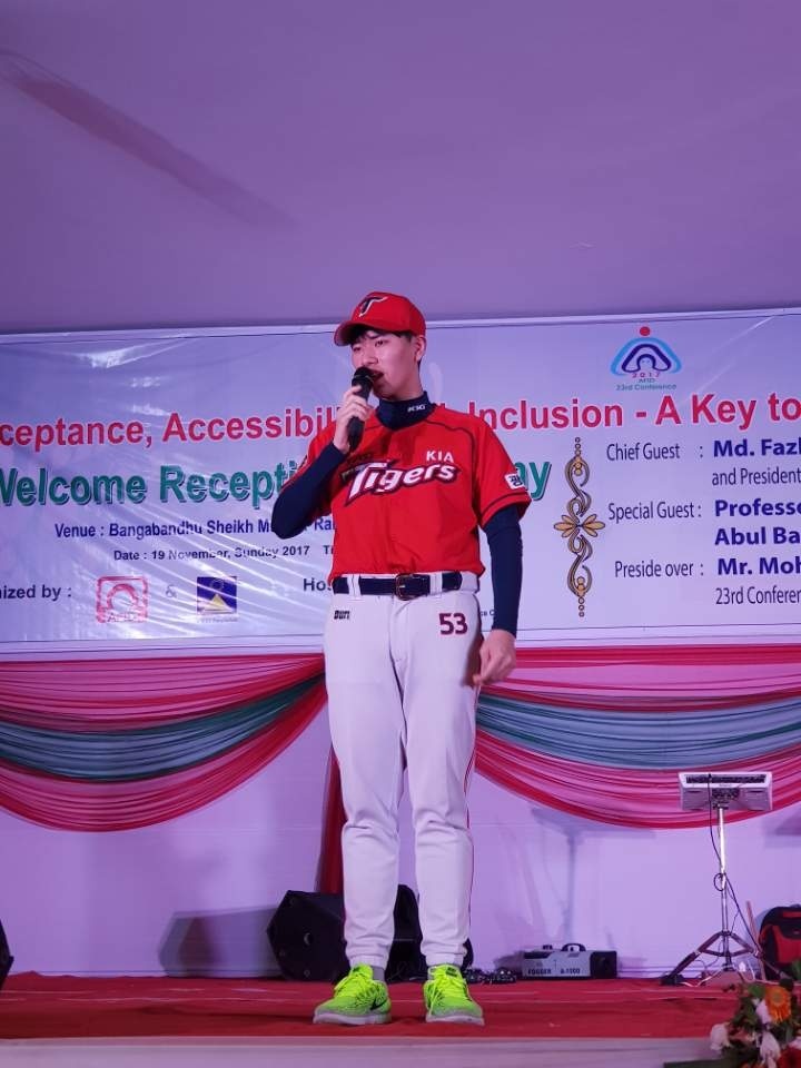 ▲ 방글라데시에서 열린 아시아 발달장애인 자기권리주장대회에서 E.T야구단 이야기를 하는 민성이 ⓒ 위기브