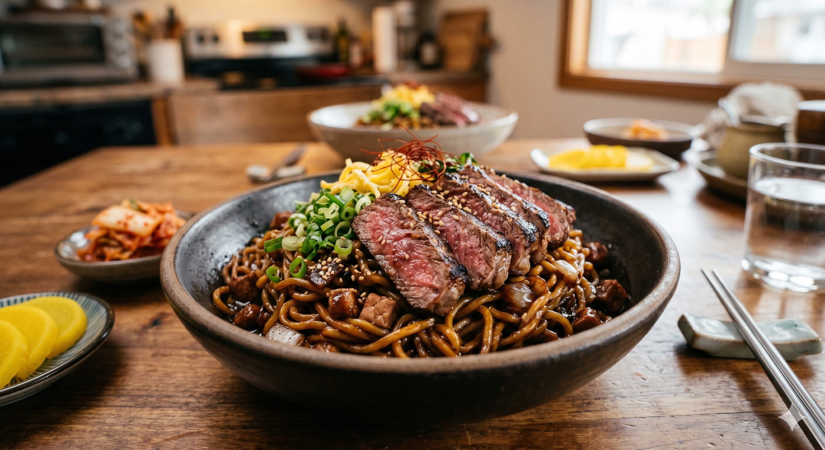 짜파게티에 한우 등심을 올리면 완전히 다른 요리가 돼요. 고소하고 감칠맛 나는 짜장 소스 위에 육즙 가득한 등심이 더해지면, 라면이라기보다 제대로 된 고급 요리처럼 느껴지거든요. 필요한 재료는 간단해요.