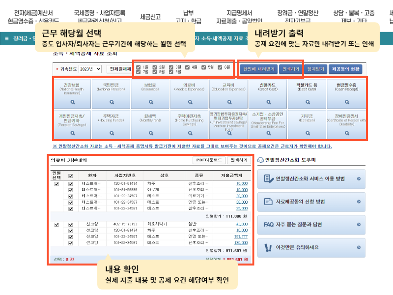 팝업창의 유의사항 확인 후 국민연금, 보험료, 신용카드, 현금영수증, 기부금 등 각 항목에서 필요한 자료 클릭 및 조회