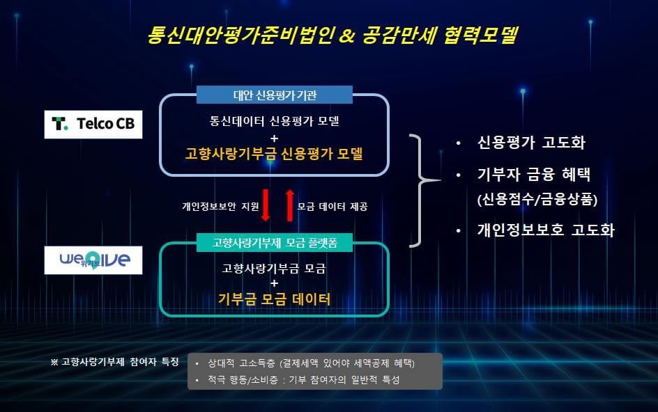 이날 협약에 따라 양 사는 고향사랑기부제 활성화와 건전한 기부 문화 조성에 힘을 모으는 한편, 상호 정보를 공유해 공공과 개인 이익 증대를 도모하기로 했다. 통신대안평가준비법인은 고향사랑기부제 모금 플랫폼 데이터를 활용해 신용평가 모델을 만들고, '공감만세'는 개인정보보안 지원과 법인 데이터를 활용한 신규 사업 개발에 나서는 방식이다.