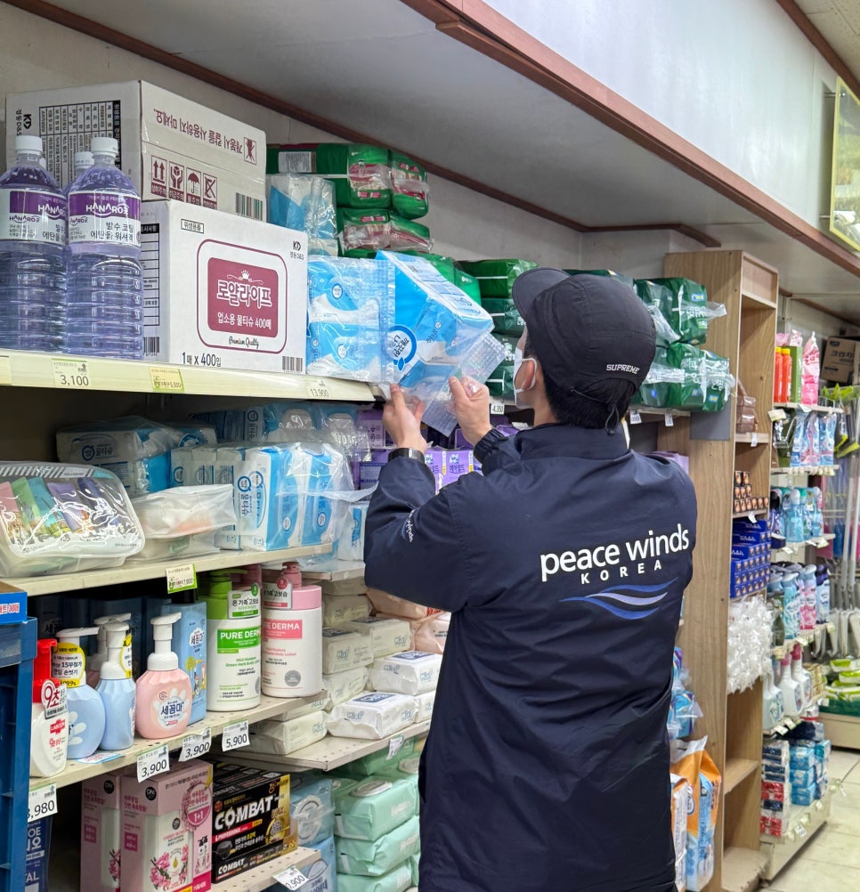 ▲생필품을 사고있는 긴급 구호 전문 NGO 피스윈즈
